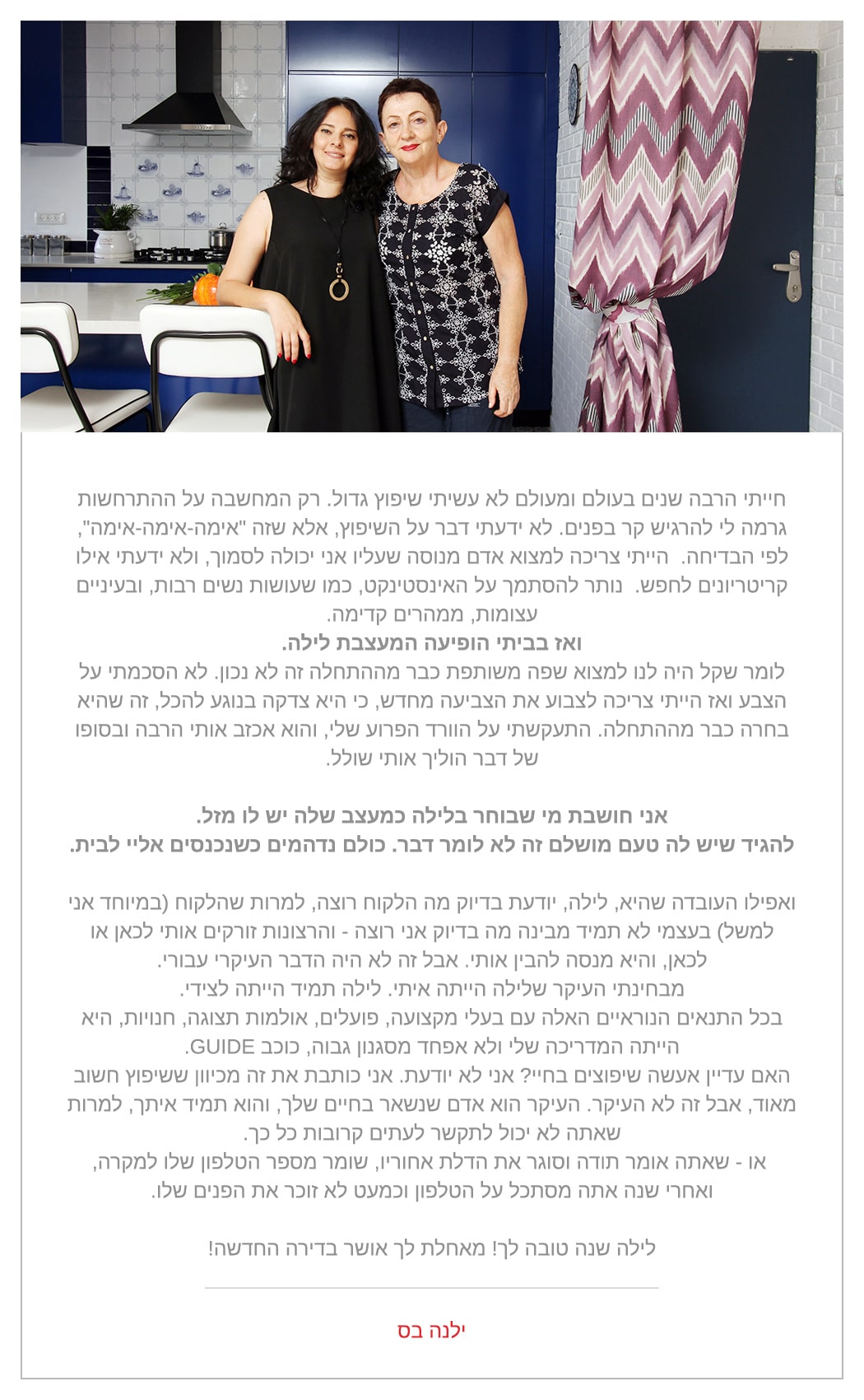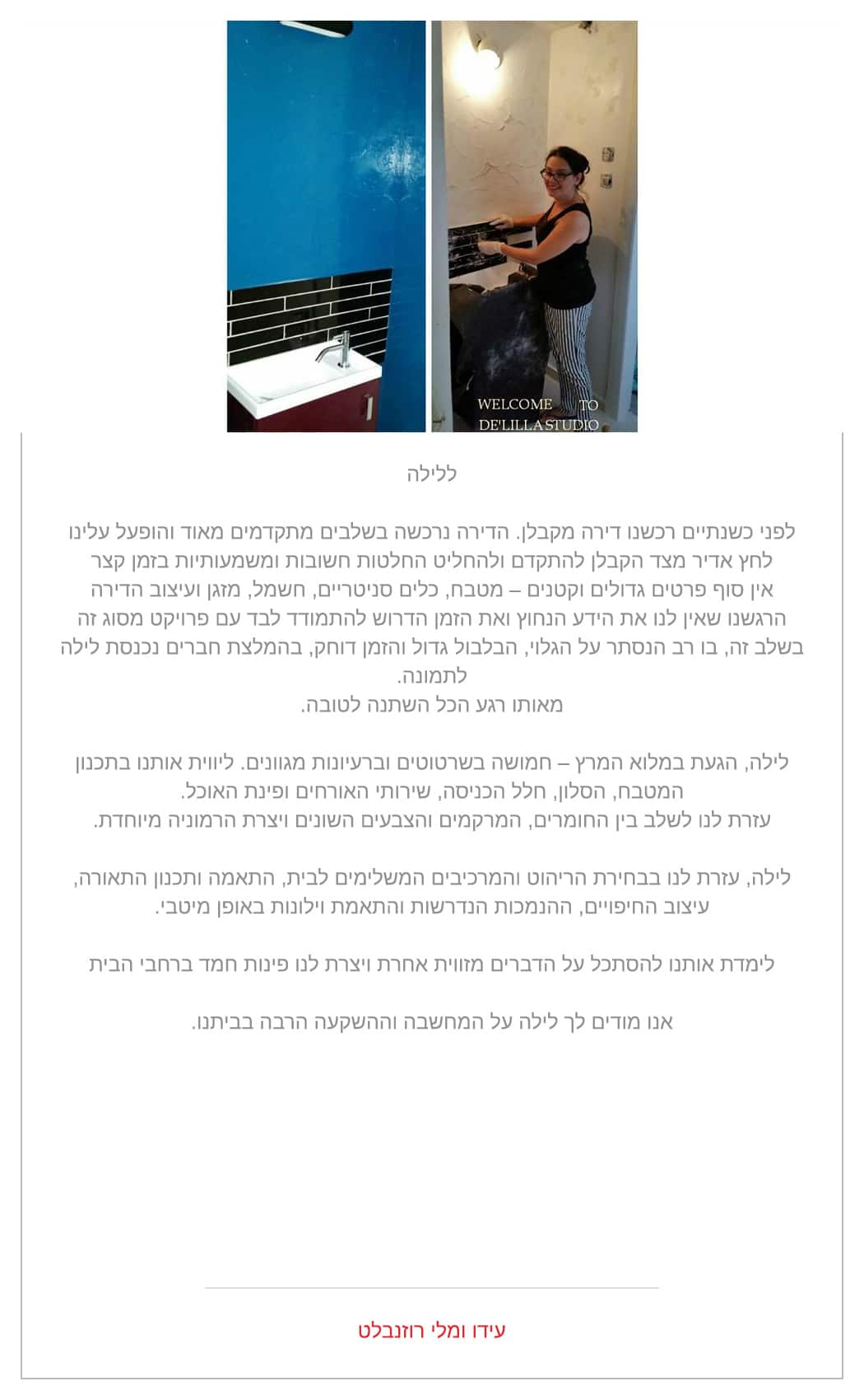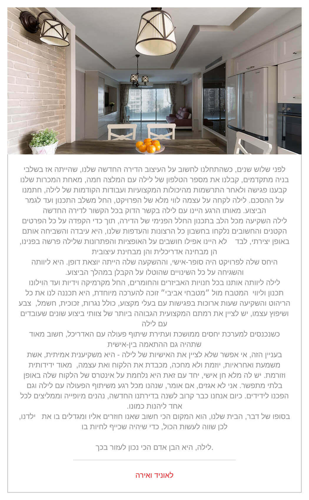 במידה ואתם מחפשים מעצבת פנים לדירה גדולה חשוב כי לא תסתפקו בהמלצות או חוות דעת בלבד, אלא תבקשו לראות גם תיק עבודות. בנוסף, חשוב כי יהיה בניכם לבין מעצבת פנים