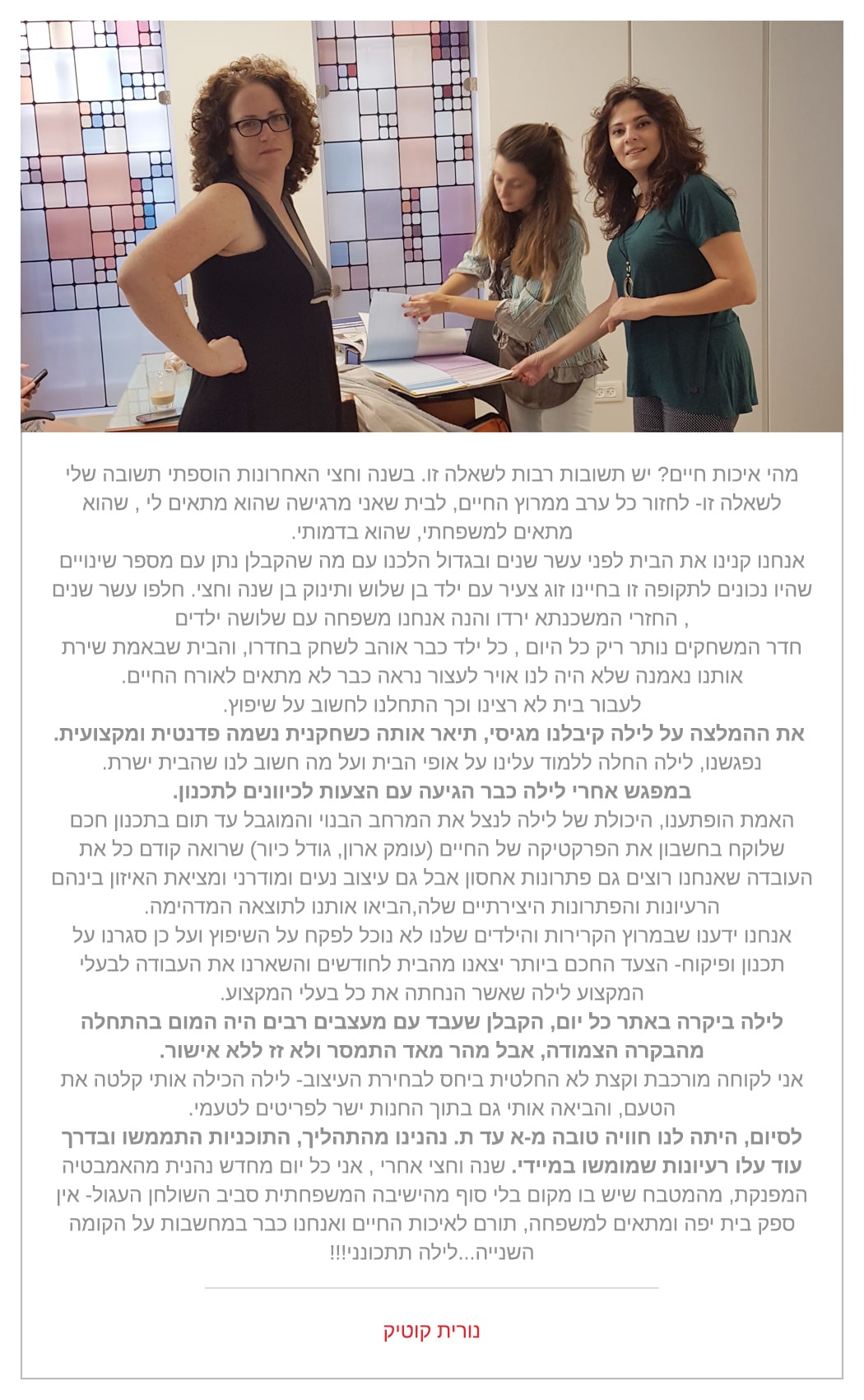 אני אוהבת את הקסם שביצירה ומאמינה בתהליך עצמו שמביא לתוצאה מרהיבה. החיוכים והשמחה של הלקוחות שלי מרגשים אותי בסיום כל פרויקט.